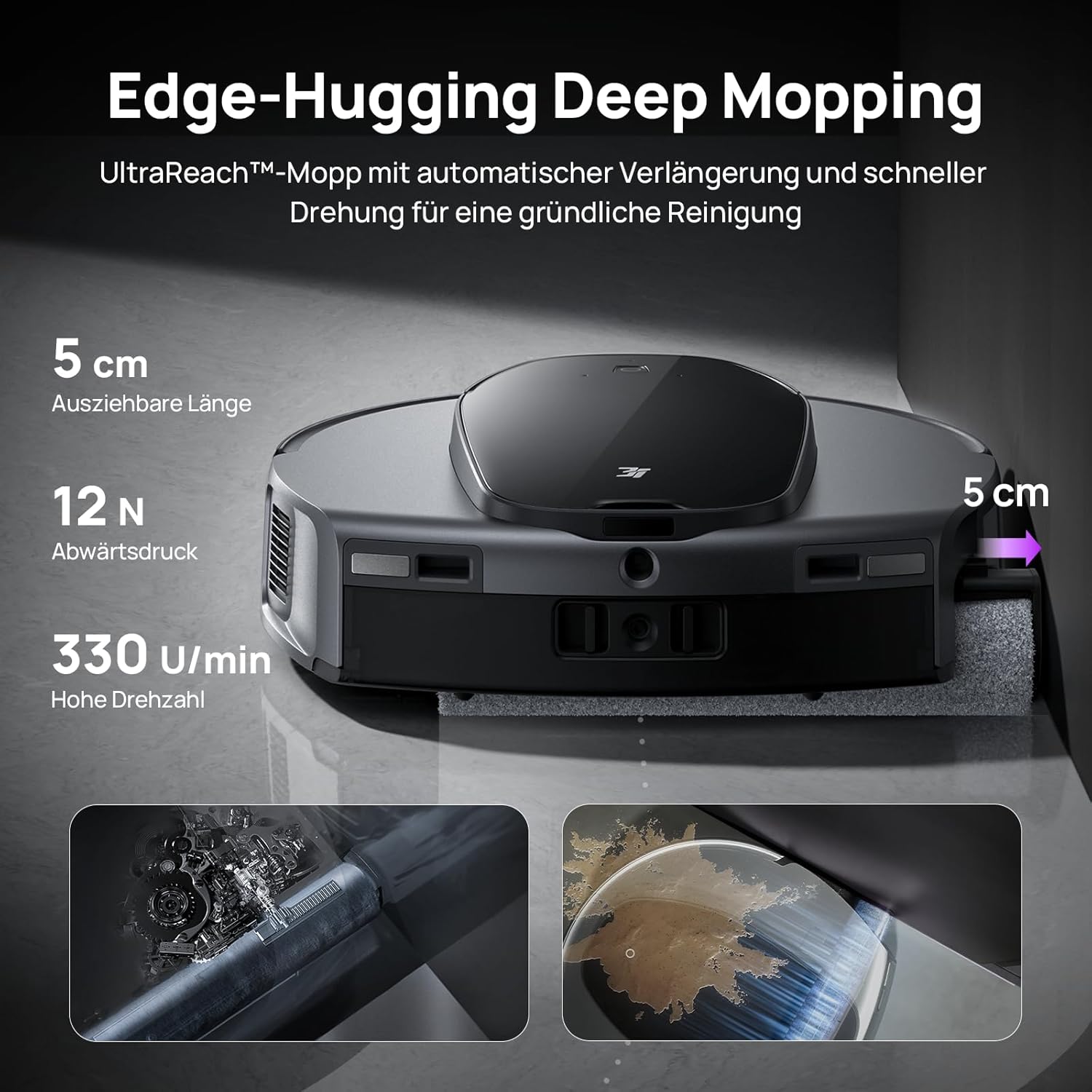 - 【UltraReach ausziehbarer Rollenwischer】Dieser selbstreinigende Saugroboter-Wischmopp arbeitet mit 330 U/min und steigert die Reinigungsergebnisse um 153 %. Er verfügt über 12 Sprühlöcher für einen konstanten Fluss von destilliertem Wasser und bietet über 7N konstanten Wischdruck. Der eingebaute Schaber hält den Rollenwischer sauber, während die automatische Verlängerung eine präzise Reinigung entlang der Wände bis auf den Millimeter ermöglicht