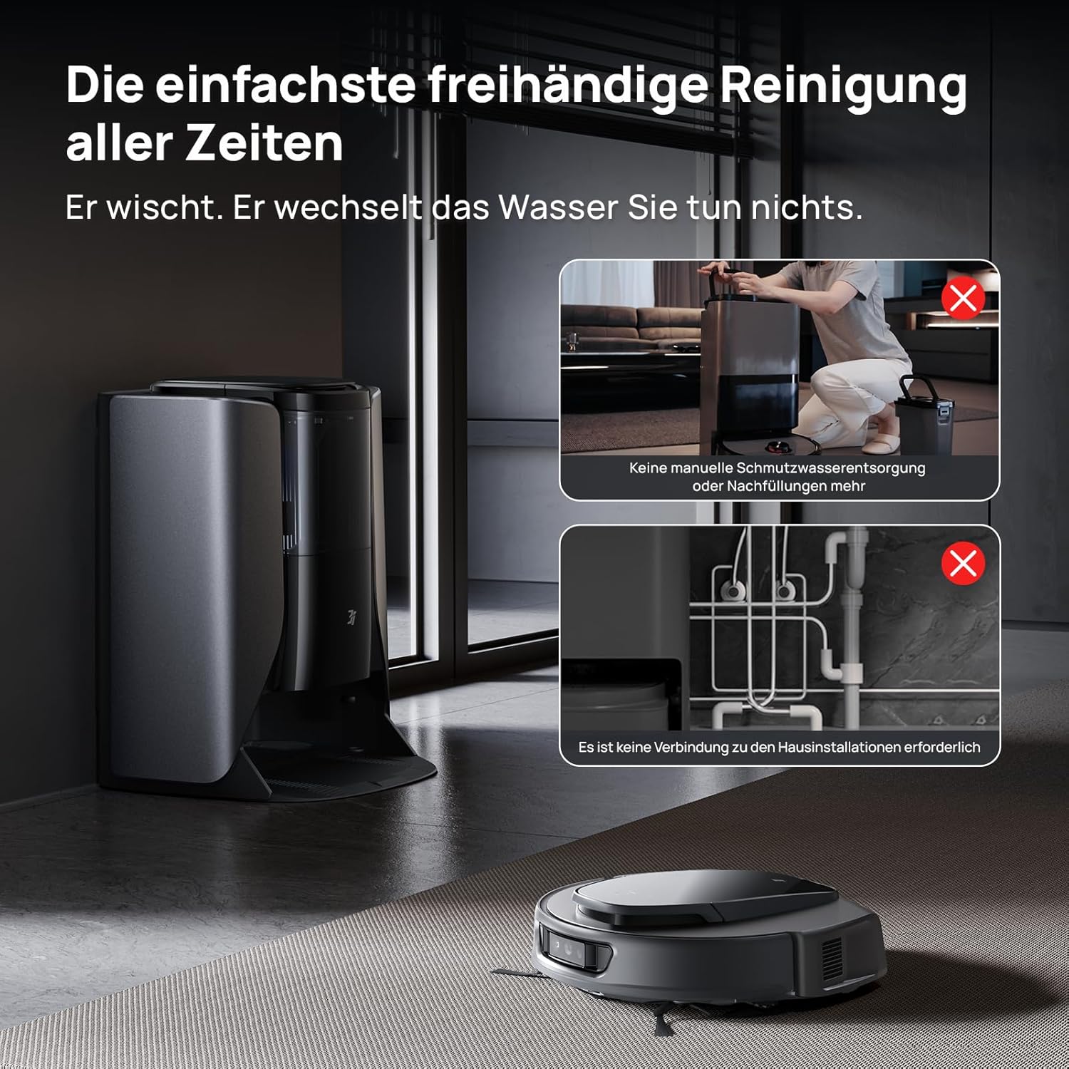 - 【Weltweit erstes WaterRecycle-System】Kein manueller Wasserwechsel, keine Entwässerung oder Installation erforderlich, der 3i S10 Ultra Saugroboter mit absaugstation hat das WaterRecycle-System eingeführt, es destilliert Abwasser und fängt Luftfeuchtigkeit ein, um gereinigtes Wasser zu erzeugen, was eine endlose Versorgung gewährleistet. Dieses umweltfreundliche Design macht Wasseranschlüsse überflüssig und ermöglicht eine flexible Platzierung überall im Haus