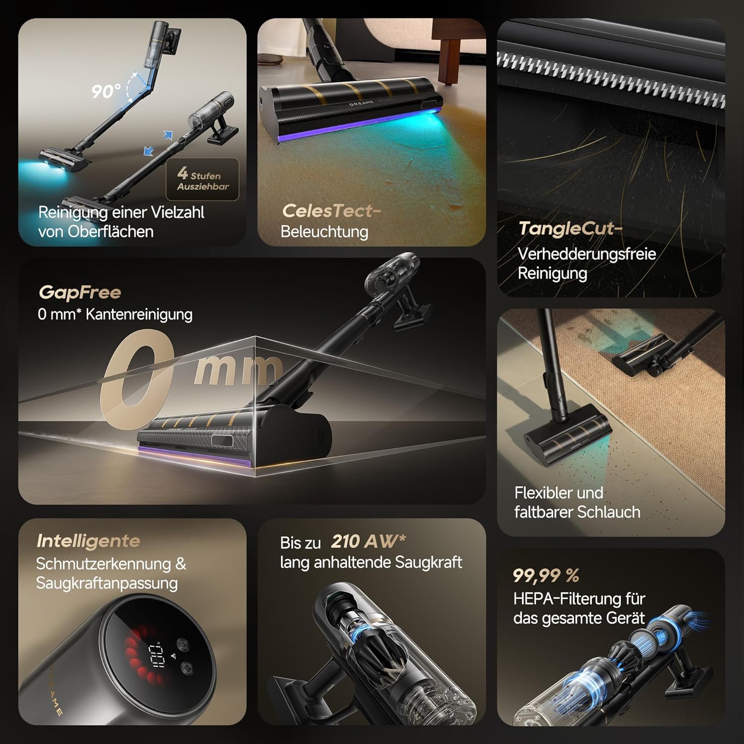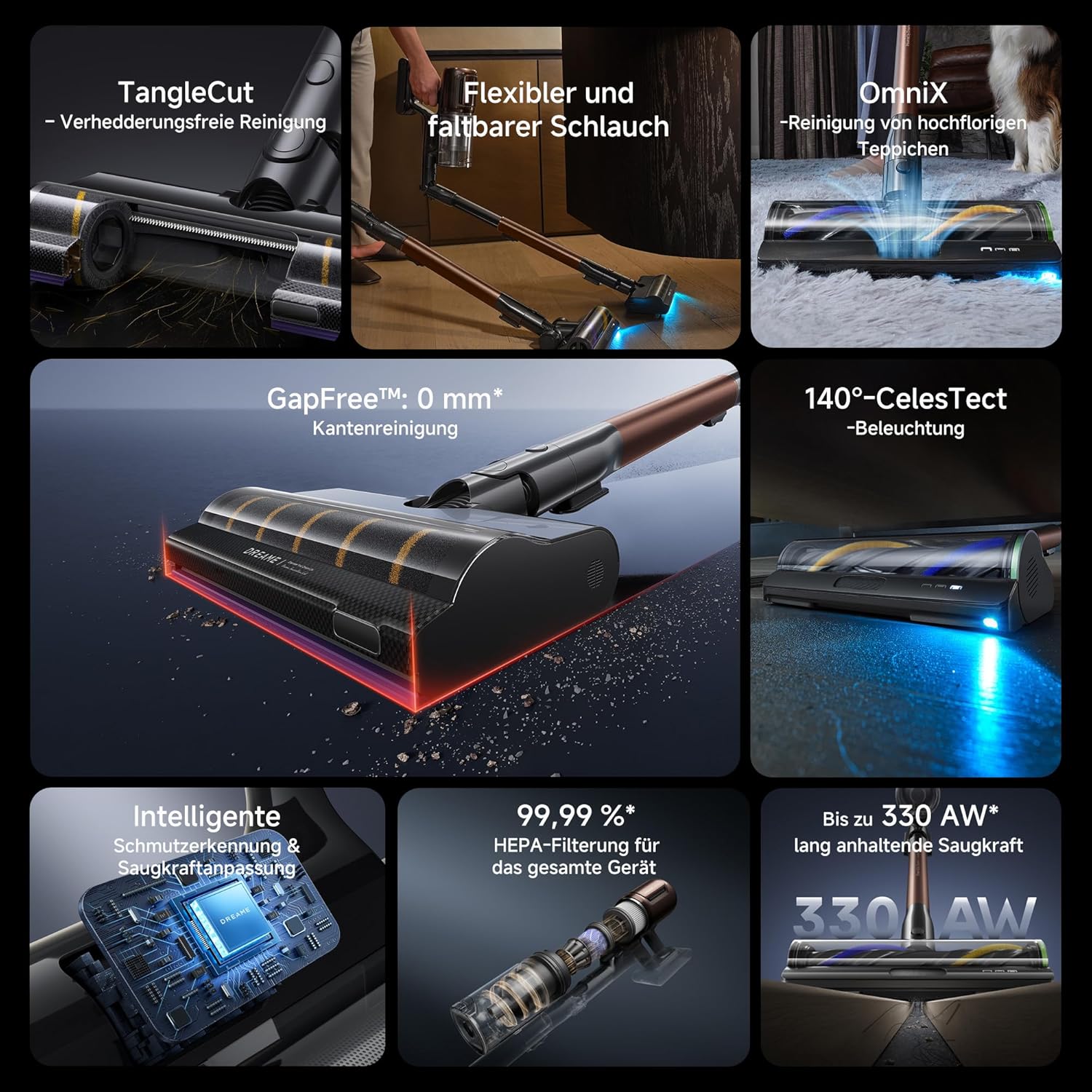 - Multi-Oberflächenbürste – Macht Staub sichtbar und passt sich dem Boden an: Die Multi-Oberflächenbürste kombiniert eine CelesTect-LED-Beleuchtung mit V-förmigen Borsten und hebt Ihr Reinigungserlebnis auf ein neues Niveau. Das hochentwickelte Beleuchtungssystem bringt versteckten Staub