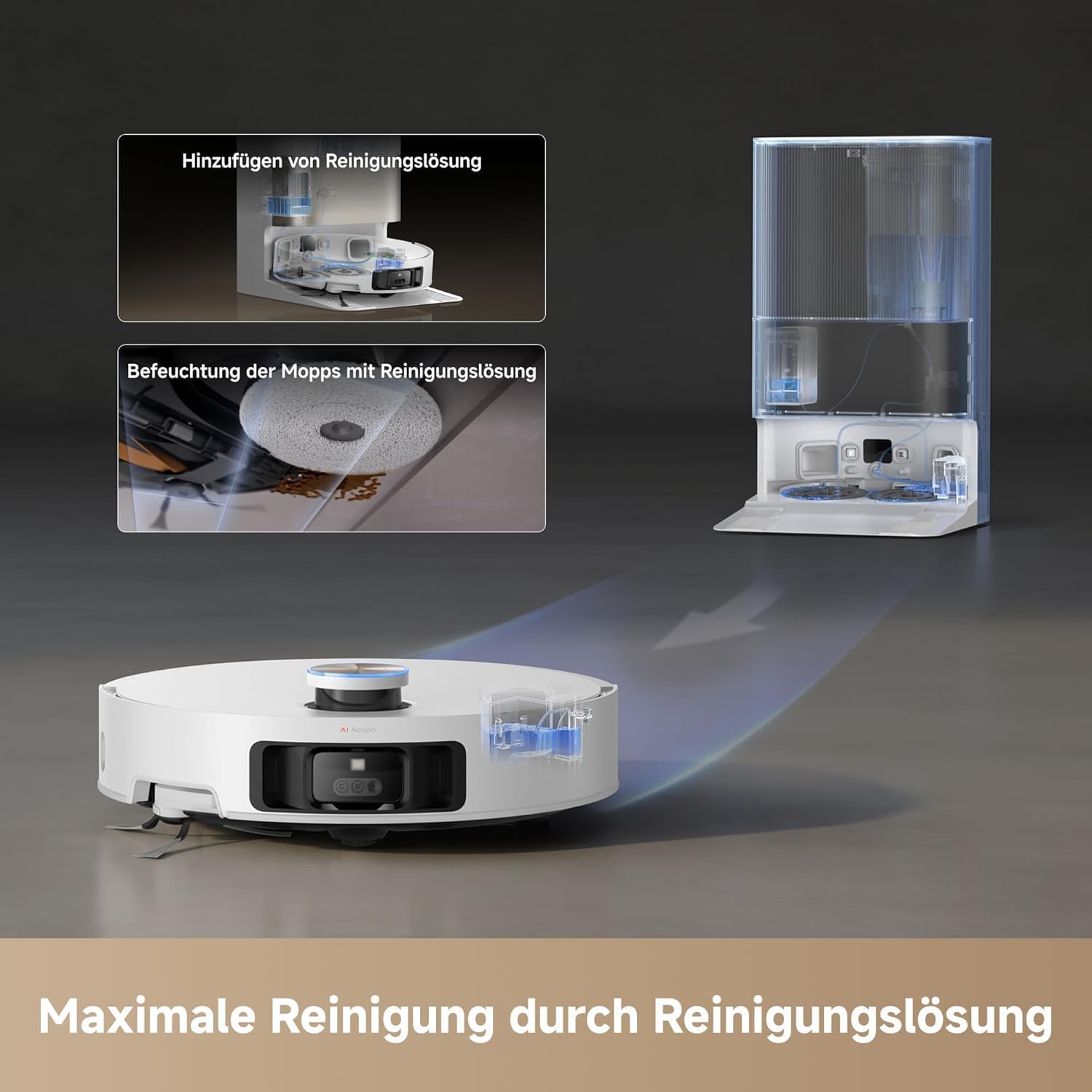- Einfaches Reinigen unter Sofas und mehr: Die VersaLift Navigation senkt die Höhe des X50 Ultra Complete auf 89 mm, so dass er problemlos unter Möbeln hindurchfahren kann. Die KI-Kamera mit LED-Lenkung in engen Bereichen sorgt für präzise Navigation und Hindernisvermeidung.