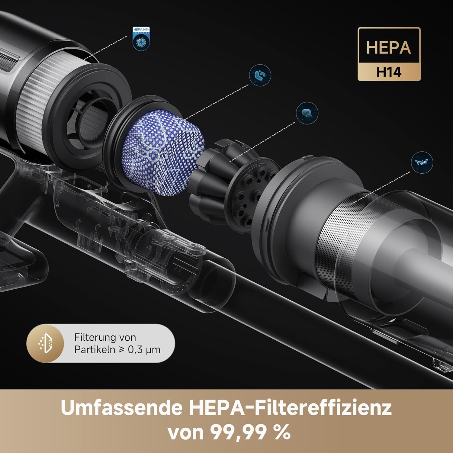 - Hohe Filterleistung und intelligente Reinigung: Mit einer Effizienz von 99,99 % bei der Filterung von Partikeln bis zu 0,1 μm verfügt der Z30 über einen HEPA-14-Filter, der Staub und Viren zurückhält. Der Z30 verfügt über eine Stauberkennung, eine automatische Sauganpassung und Echtzeitergebnisse zur Überwachung der Reinigungsleistung.