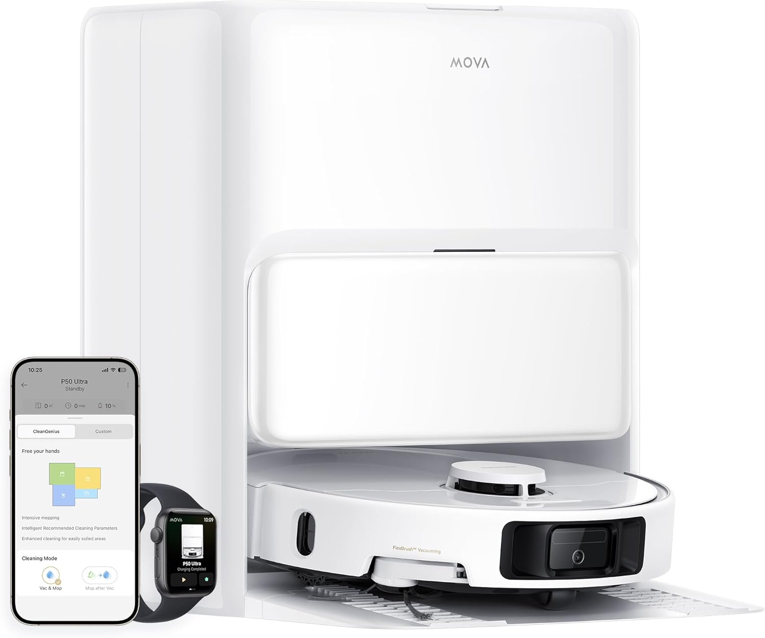 Mova P50 Pro Ultra Staubsaugerroboter mit Mopp, 19.000 Pa, 75℃ Selbstreinigender Heißwasser-Mopp mit Auszug Seitenbürste, LDS-Navigation,+RGB AI+LED-Hindernisvermeidung, Auto-Entleerung/Nachfüllen