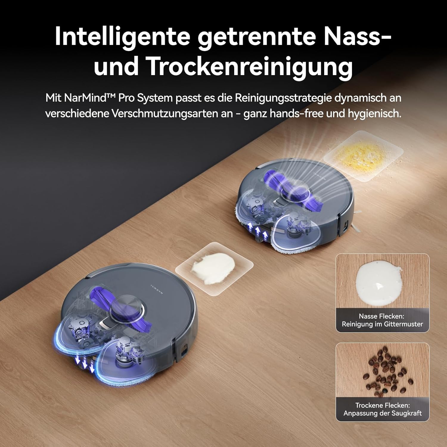 - NarMind Pro Autonomes System: Der roboterstaubsauger ist mit zwei Kameras und einem Dual-Chip ausgestattet und kann über 200 Objekte mit einer Genauigkeit von 5 Millimetern erkennen und verarbeiten. Er optimiert sich selbstständig durch tägliche Nutzung – ganz ohne Einrichtung, um dauerhaft saubere Böden zu gewährleisten.