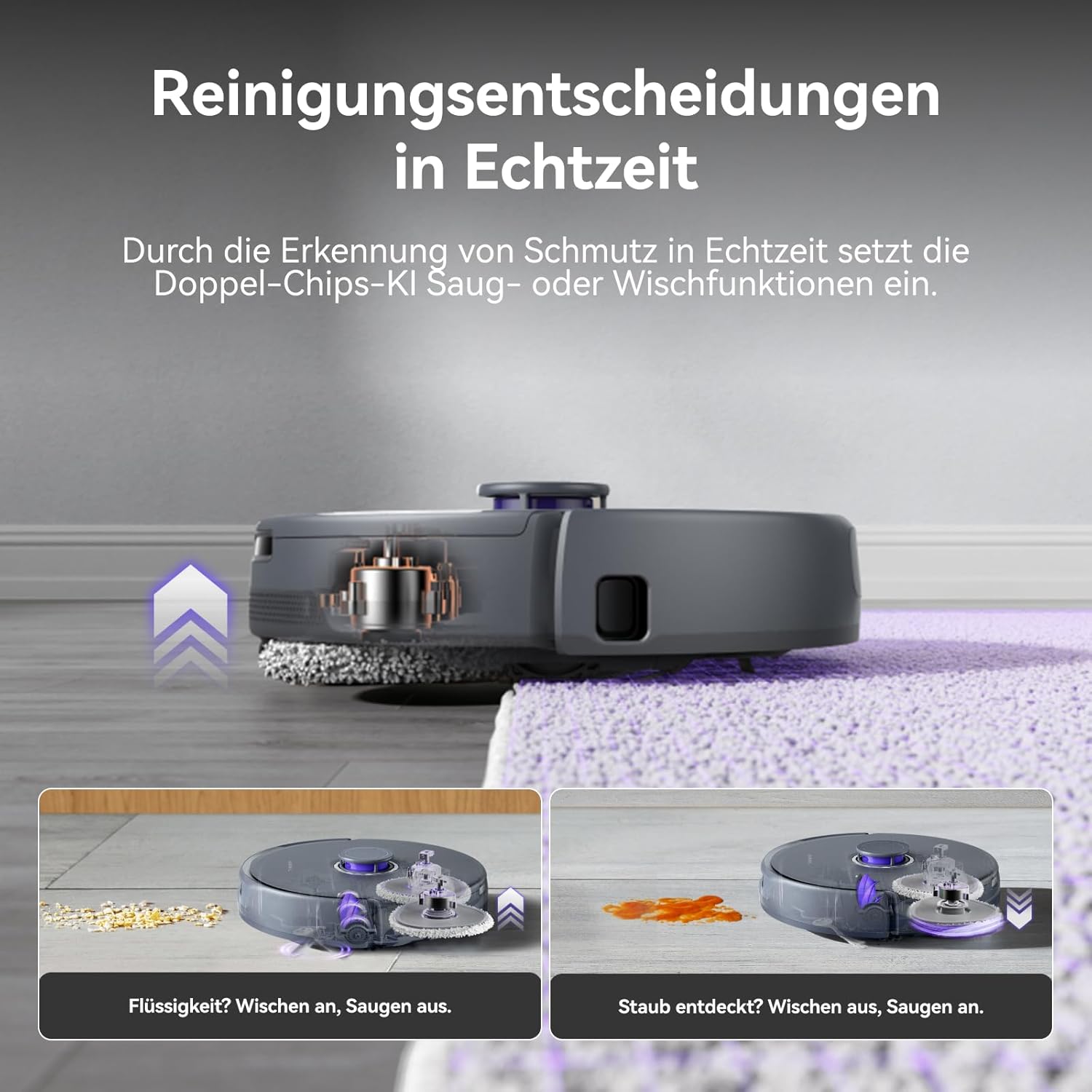 - Dynamische Kanten- und Eckenreinigung: saugroboter mit wischfunktion Der Mopp fährt intelligent bis in 0 mm Lücken aus. Erkennt Kabel und Kleinteile ab 8 mm. Endlich werden auch Kanten gründlich gereinigt – ganz nach Ihren Ansprüchen.