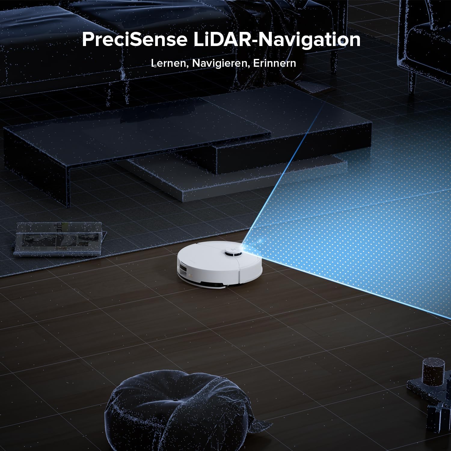 - Reactive Tech Hindernisvermeidung: Dieses fortschrittliche System, das mit strukturiertem Licht betrieben wird, erkennt mühelos Hindernisse und umgeht sie, selbst in unübersichtlichen Räumen mit verstreuten Gegenständen auf dem Boden.